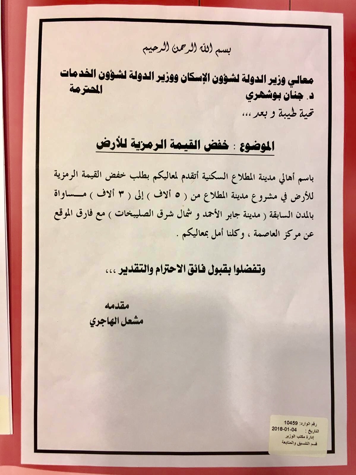 قدم طلباً باسم أهالي...